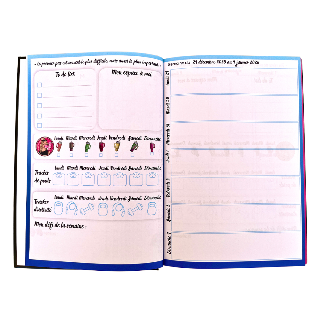 - Des pages dédiées à tes objectifs annuels, mensuels, hebdomadaires,